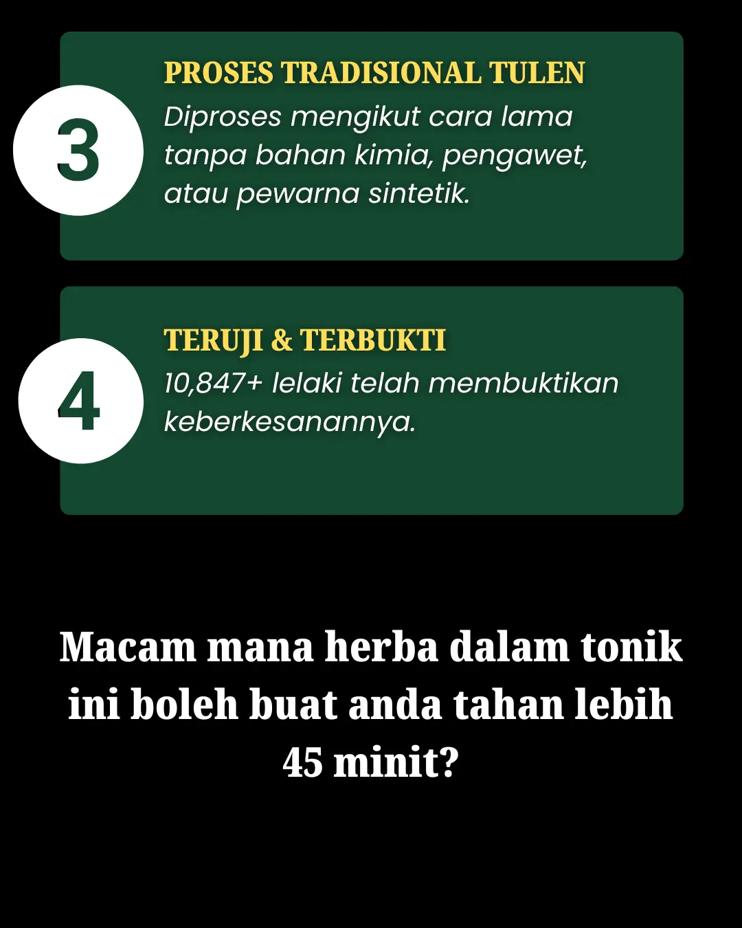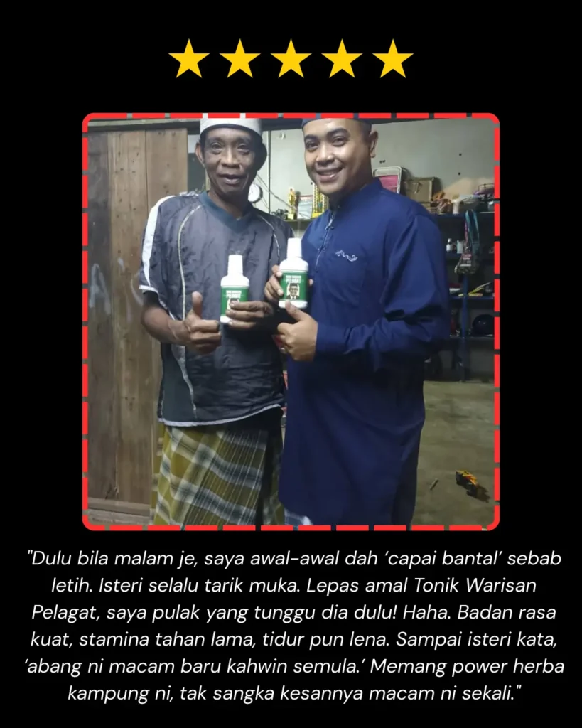 Jadi, bila semua bahan ni digabung dalam Tonik Warisan Pelagat, ia bukan sekadar minuman tenaga โ tapi satu ramuan warisan kampung Kelantan yang penuh cerita dan fungsi untuk lelaki.
